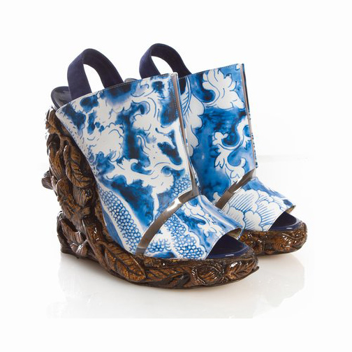 Inspired by the diverse structure of Chinese woodcarvings, the latest collaborative installment from Rodarte & Nicholas Kirkwood brings a phenomenal collection of mixed-media, sculptor-made wedges reminiscent of the most ornate of fairytale forests. carved, glossed, printed, embossed, and gilded, each pair harnesses a chaos of texture that nonetheless unites in stunning harmony.